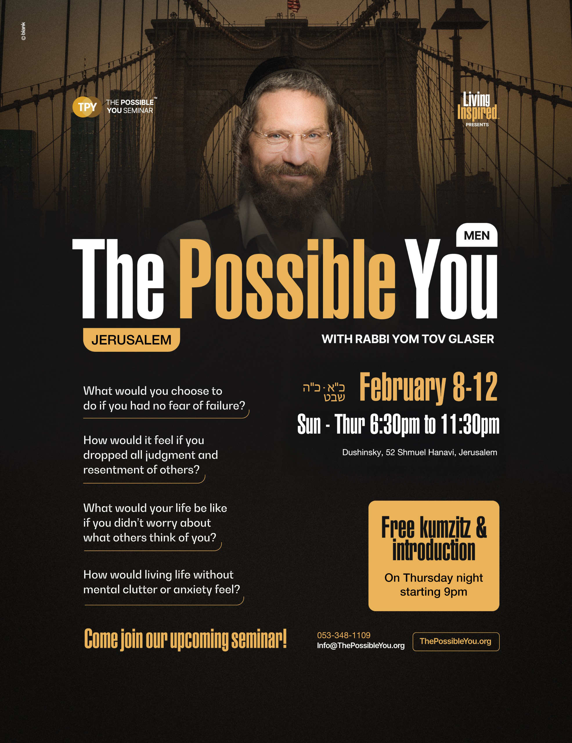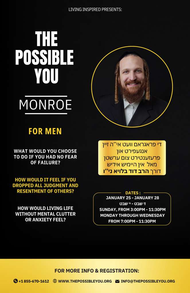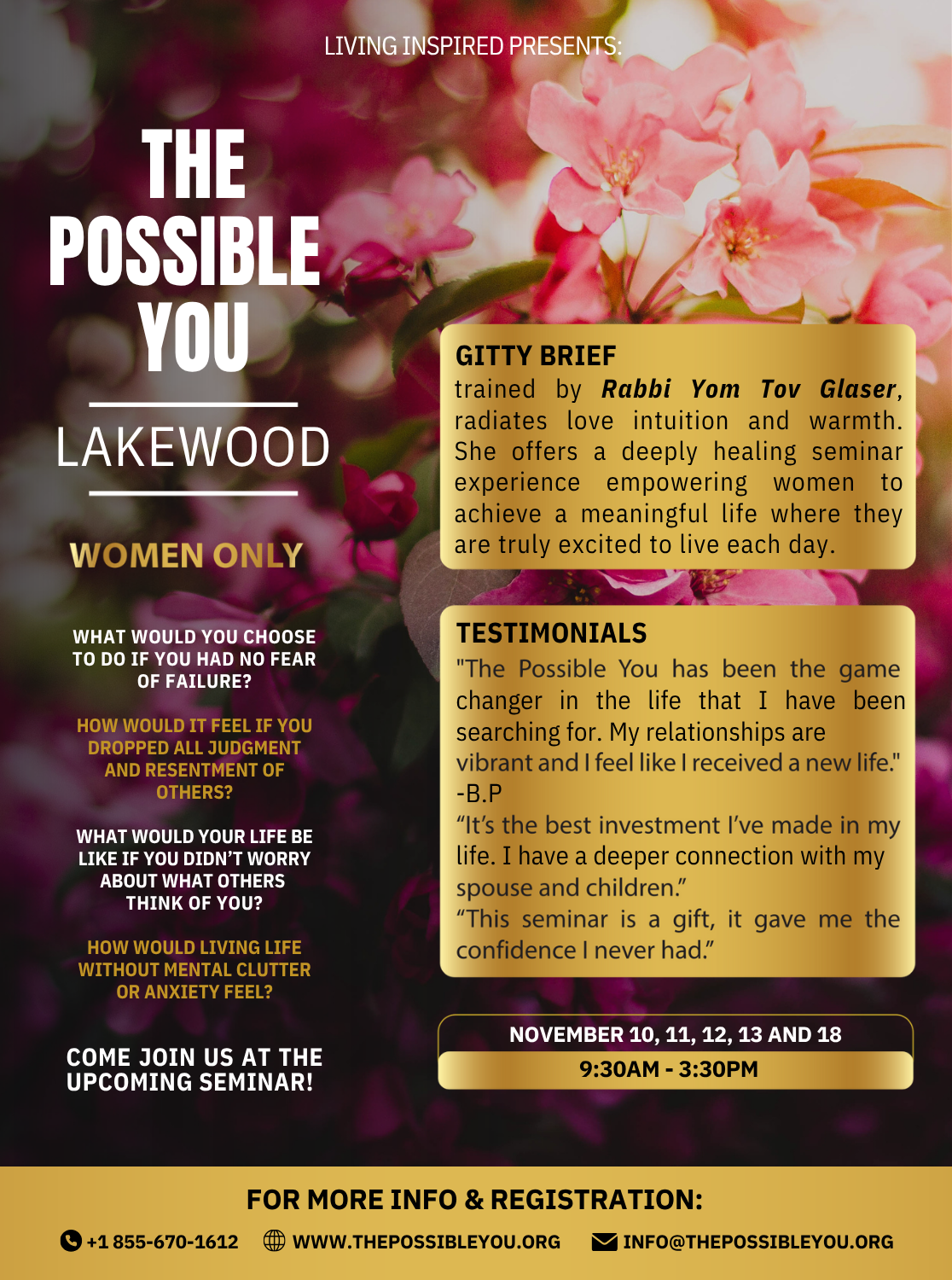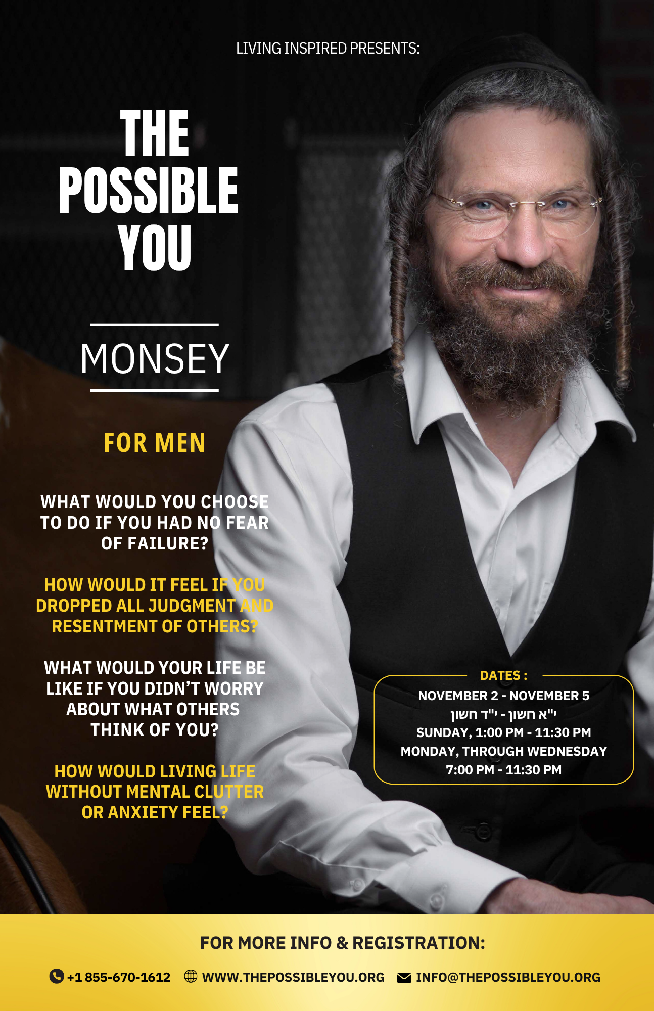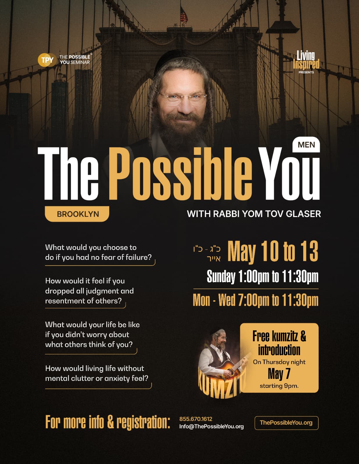 The Possible You seminar is a transformative experience designed to help individuals uncover their potential, break through personal barriers, and create meaningful change in their lives. Through introspection, guided exercises, and deep connection, participants gain clarity, empowerment, and tools to achieve their goals and build stronger relationships. Led by Rabbi Yom Tov Glaser, the seminar offers a safe and supportive space for growth, healing, and discovering new possibilities.