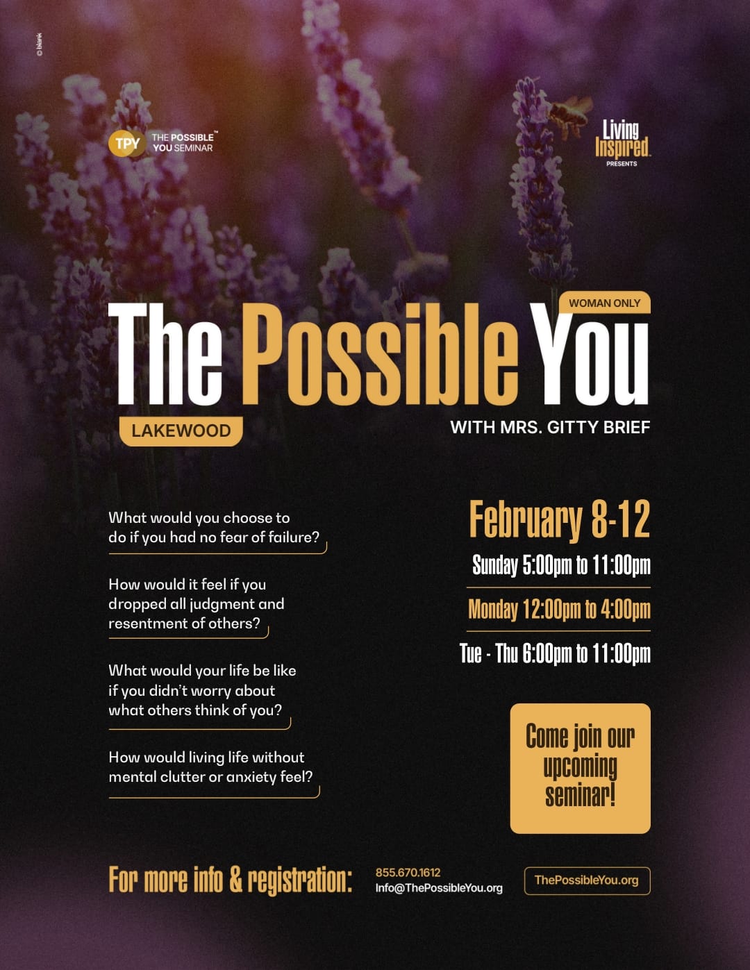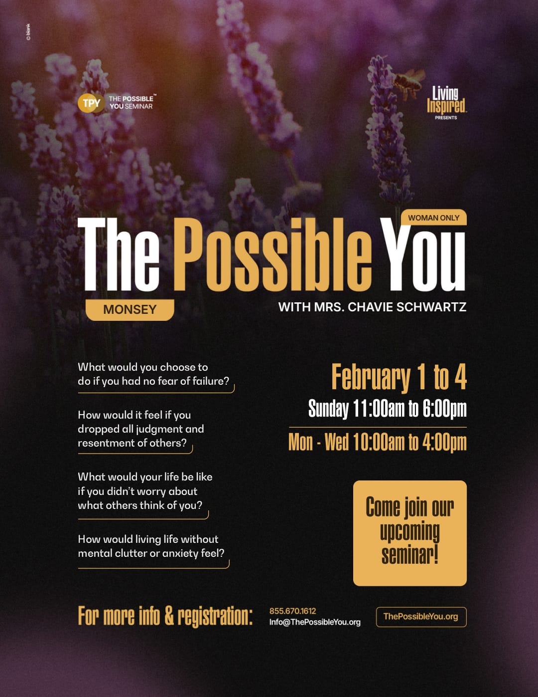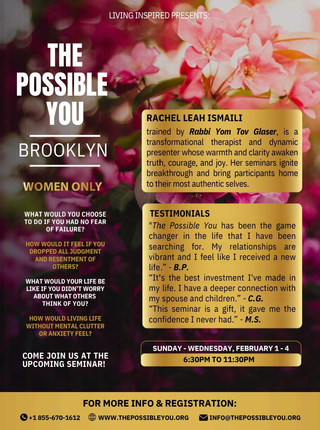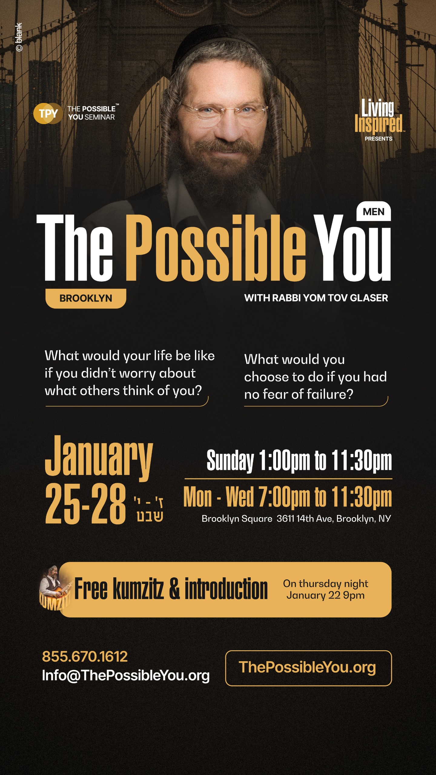 The Possible You seminar is a transformative experience designed to help individuals uncover their potential, break through personal barriers, and create meaningful change in their lives. Through introspection, guided exercises, and deep connection, participants gain clarity, empowerment, and tools to achieve their goals and build stronger relationships. Led by Rabbi Yom Tov Glaser, the seminar offers a safe and supportive space for growth, healing, and discovering new possibilities.